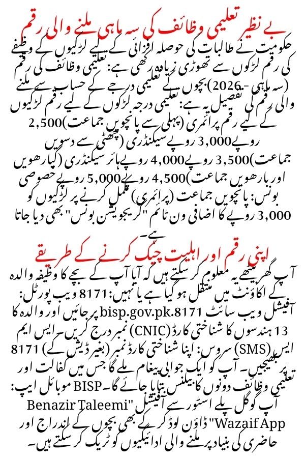 - BISP Mobile App: Log in to the official Benazir Taleemi Wazaif App to track enrollment and attendance-linked payments.